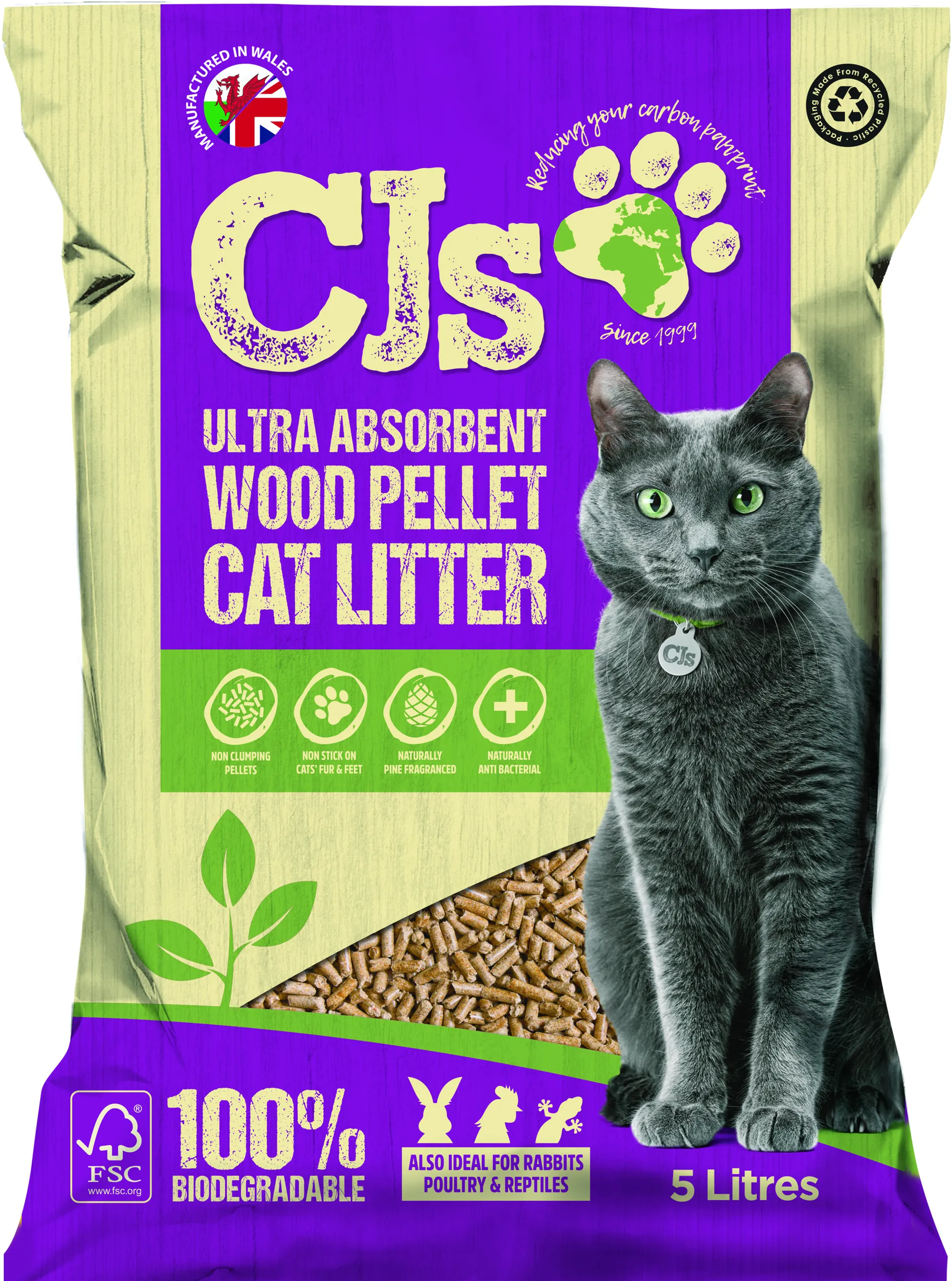 CJs Ultra Absorbent Wood Pellet Cat Litter. 100% Biodegradable wood pellets, from 100% virgin softwood residue, the majority of which is sourced from sawmills within 40 miles of CJs factory. As it is antimicrobial, germs and bacterial cannot form on it, meaning that any odours are completely eradicated, not just masked with a scent. As the litter is ultra-absorbent, any liquid is soaked up. To keep the litter clean and fresh, remove anything your pet has left and shake the tray to bring fresh pellets to the surface. To dispose of the litter, add to your usual household waste or use for compost. The litter is 100% biodegradable! The soft pellets don’t stick to paws so you won’t have to clean up any tracking or find surprises elsewhere.