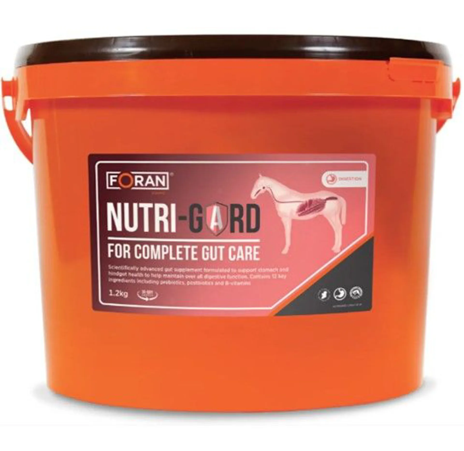 Foran Equine Nutri-Gard for complete gut care. Foran Equine Nutri-Gard (New and Improved Formula) offers gastric health support through an enhanced prebiotic, highly digestible fibres and B-vitamins to promote appetite Gut balancer for horses, Ulcer supplement for horses, Gut supplement for horses, Probiotics for horses, Digestive supplement for horses, Ulcers in horses. Care for your horse from the inside out with the digestive health benefits of NUTRI-GARD
