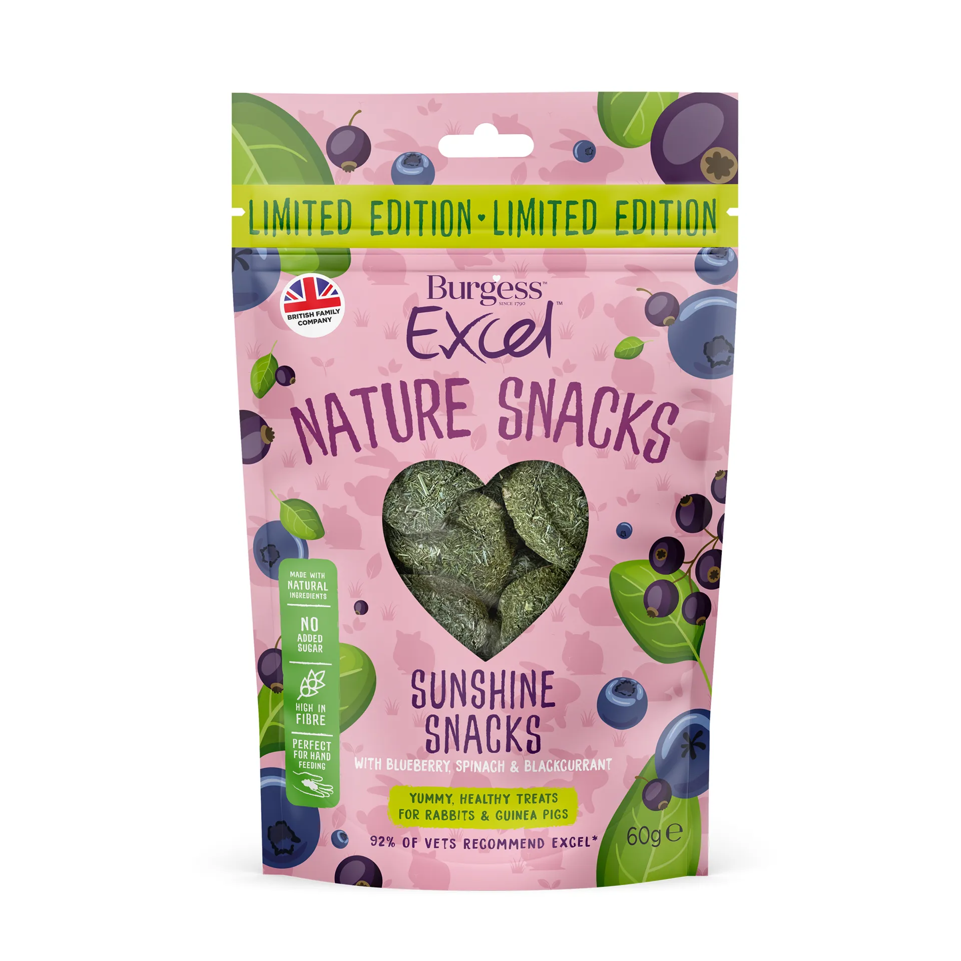 Burgess Excel Nature Snacks Sunshine Small Animal Treats. Baked with love, our Excel Sunshine Snacks are irresistible to rabbits and guinea pigs and are naturally healthy too. Made with a seasonal forage blend of blueberry and spinach, Burgess Excel Sunshine Snacks are a complementary feed for rabbits and guinea pigs.