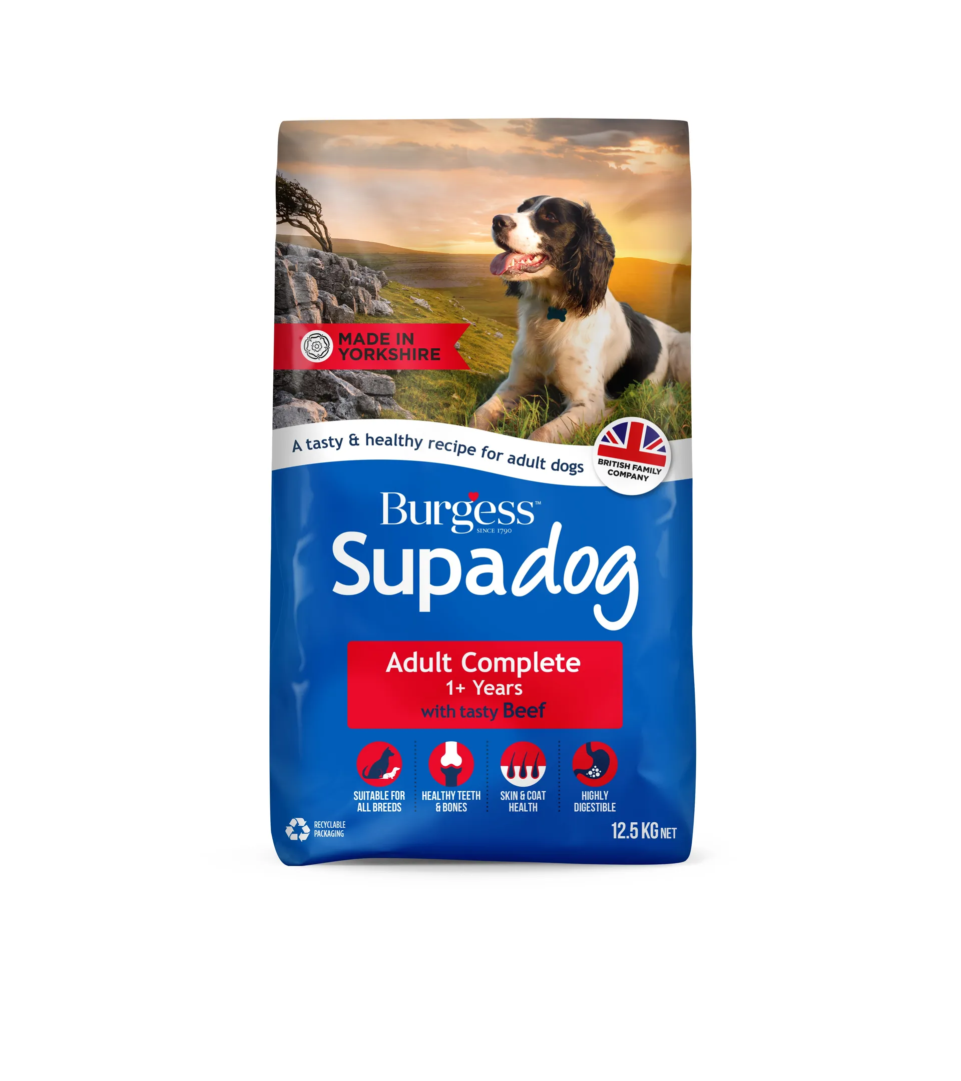 Burgess Supadog Adult Dog with Tasty Beef. Supadog Adult Complete with tasty Beef recipe has been specifically developed for all breeds of adult dogs. It contains highly digestible ingredients for healthy digestion and it also includes biotin and zinc to help your dogs coat stay shiny and healthy. Made with highly digestible ingredients to support healthy digestion. Biotin and Zinc to support skin and coat health. Fortified with calcium and minerals to support healthy teeth and bones. Specially formulated to be suitable for all breeds.