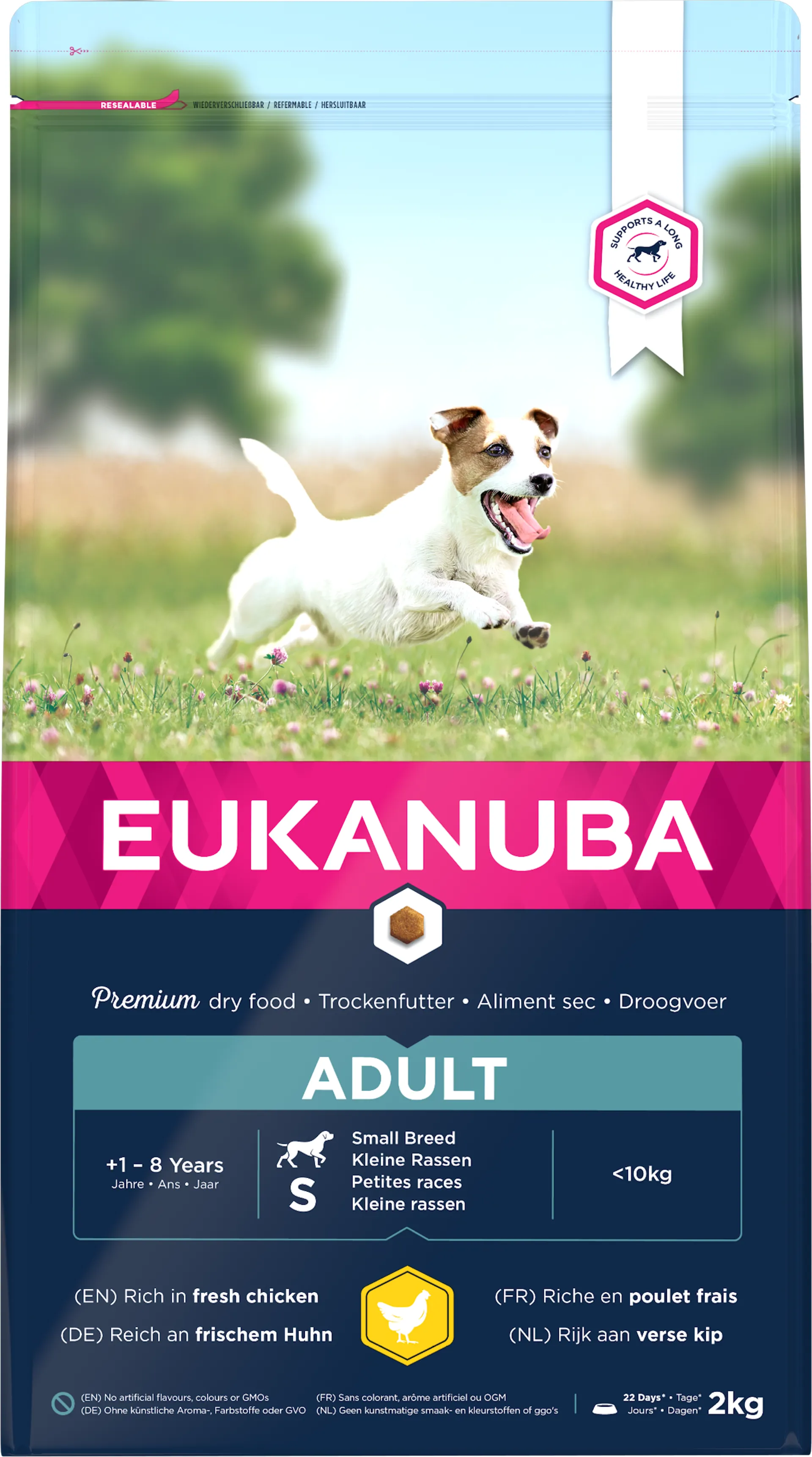 Eukanuba Adult Small Breed Chicken. Eukanuba dry food kibbles are rich in fresh chicken and perfect for small sized adult dogs aged from 1 to 8 years. L-Carnitine contained in Eukanuba dry food supports the reduction of body fat and allows your dog to maintain an optimal weight resulting in less strain on the joints. The tailored fibre blend of prebiotic FOS and beet pulp promotes healthy digestion. Furthermore, the Eukanuba kibbles are beneficial for healthy skin and a shiny coat thanks to the natural sources of omega 6 and omega 3. The food also contains antioxidants vitamin E & C to help support the dog's immune system. Additionally, the unique Eukanuba hexagonal kibbles and DentaDefense dental care system support clean, healthy teeth in the long term. The food is 100% complete and balanced. Advanced nutrition for small sized adult dogs to support optimal body condition and lifelong wellbeing.