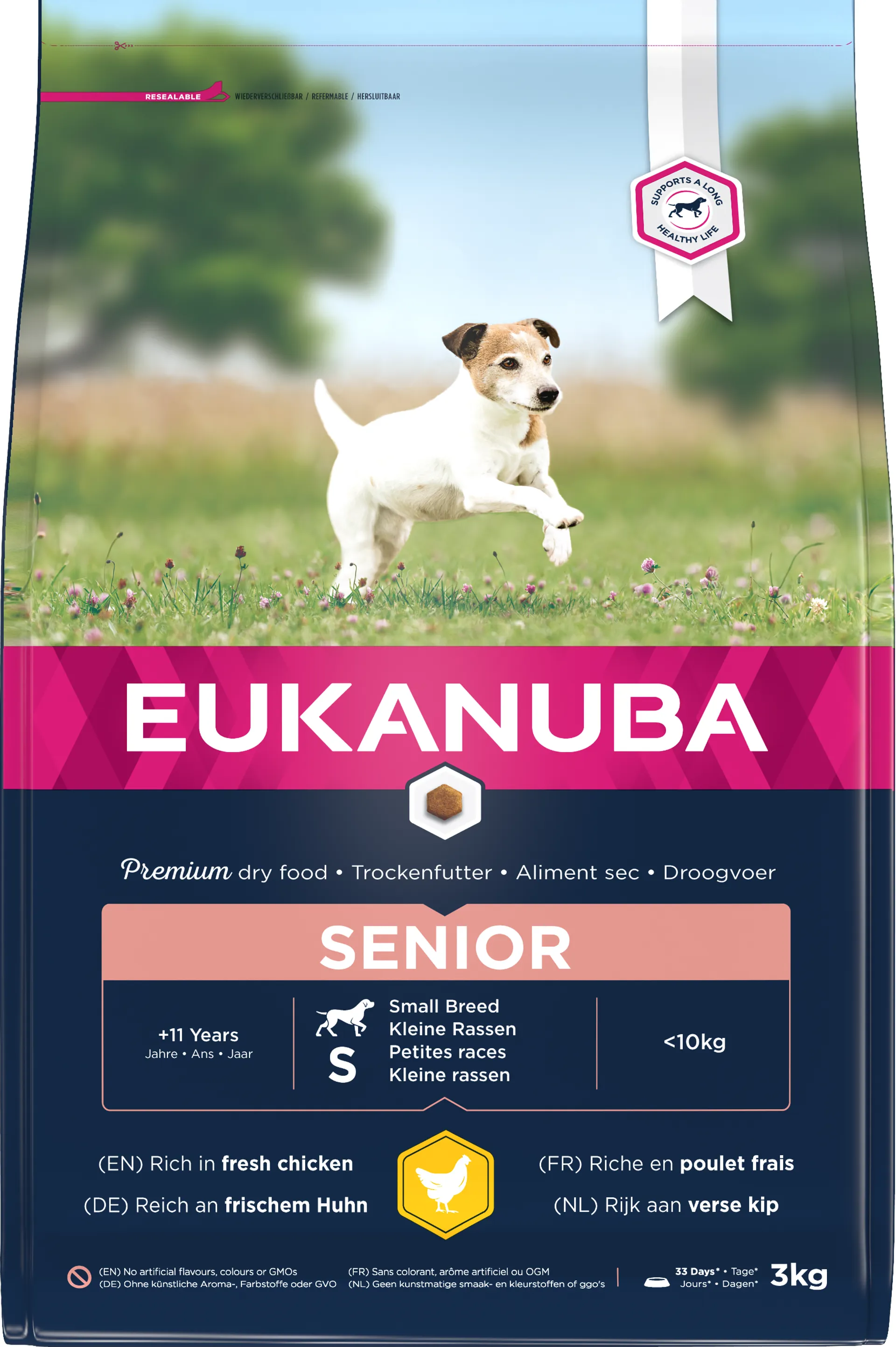Eukanuba Caring Senior Small Breed Fresh Chicken. Our unique Caring Senior recipe is tailored to support optimal body condition and support active mobility. Suitable for small breed dogs aged 11 years and over. Our tasty, small kibble is rich in fresh chicken and has been specially tailored to suit the needs of small breed dogs. Plus, its unique hexagonal shape also helps to take care of your dog's teeth. Developed by nutritionists, approved by vets and recommended by top breeders, EUKANUBA provides all the nutrition your dog needs for a long and healthy life.