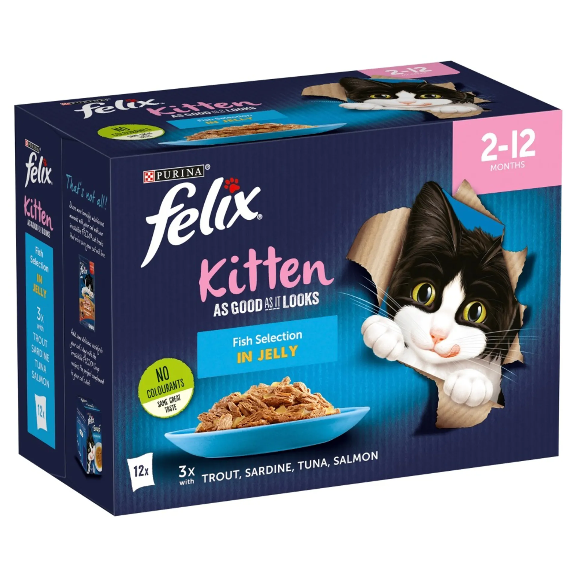 Felix Pouch As Good As It Looks Kitten Fish. The perfect meal for fish-loving felines, our FELIX As Good As It Looks Kitten Fish Selection in Jelly includes chunky pieces of trout, sardine, tuna and salmon. Packed with flavour, these fishy meals are made from high quality ingredients to provide your kitten with all he needs to help his develop and grow. With key vitamins, minerals and essential nutrients, our delicious FELIX As Good As It Looks Kitten Fish Selection in Jelly kitten food supports his development and provides his with all he needs to grow into a healthy and happy adult cat.