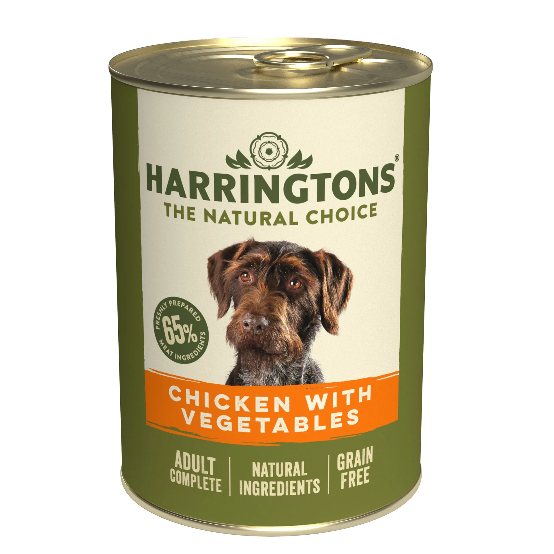 Harringtons Tins Adult Grain Free Chicken with Vegetables Dog. Harringtons Chicken with Vegetables Wet Dog Food is a complete pet food providing balanced nutrition for all adult dogs. The recipe has been carefully formulated to provide wholesome grain-free nutrition and contains no artificial colours or flavours, no dairy, no soya and no added grain. Made with natural ingredients including freshly prepared chicken, added salmon oil to help support healthy skin & coat and inulin to help with digestive health.