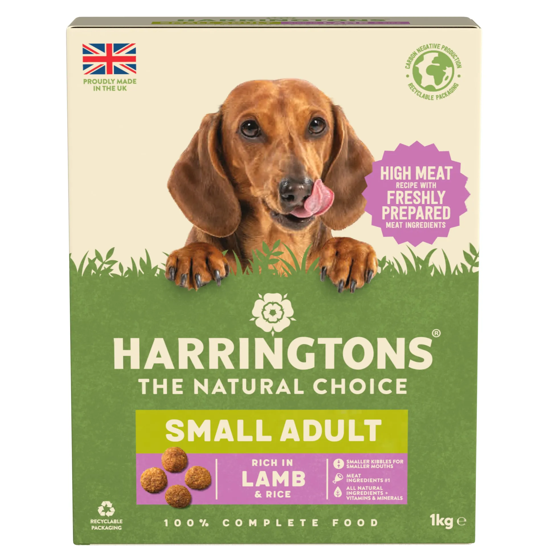 Harringtons Small Dog Adult Lamb & Rice. This new and upgraded recipe is now even more tasty and nutritious, with freshly prepared meat ingredients, vegetables, botanicals, vitamins and minerals in every bite. Packed full of natural ingredients, this recipe is carefully balanced to meet the needs of small dogs. Everything your dog needs for a happy and healthy life. No nasties, no surprises. Just natural goodness for all. Rich in Lamb and Rice, complete, for small dogs aged 8 weeks onwards.