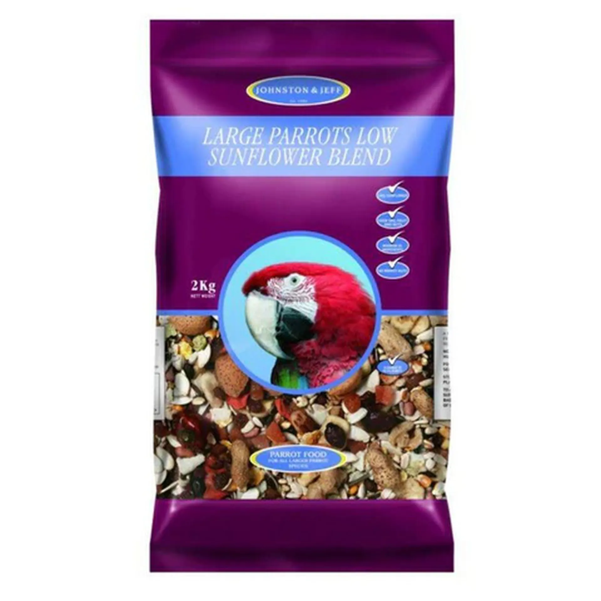 Johnston & Jeff Low Sunflower Diet Large Parrot's rich variety of ingredients provides a mix full of different tastes and texture for an interesting meal every time. Add even more interest for your bird and put part or all of each meal inside foraging devices to encourage movement and exercise, as well as providing essential mental stimulation.
