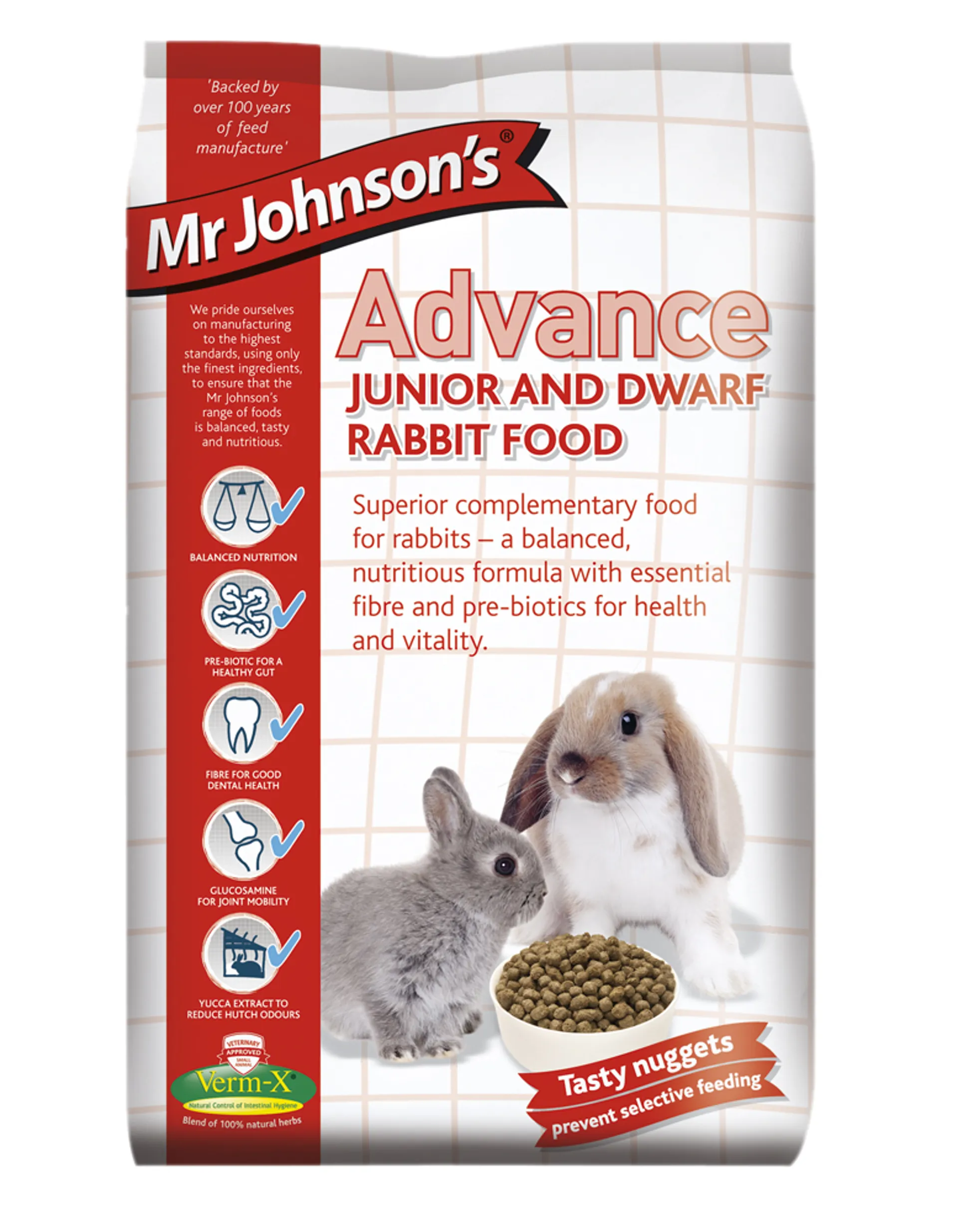 Mr Johnsons Advance Junior & Dwarf Rabbit Food is a concentrated complementary feed that is fibrous, nutritious all in one nugget. This form of food helps combat selective feeding & ensures the rabbit gets a complete diet. To ensure your rabbits digestive health is maintained provide unlimited access to good quality hay & water.