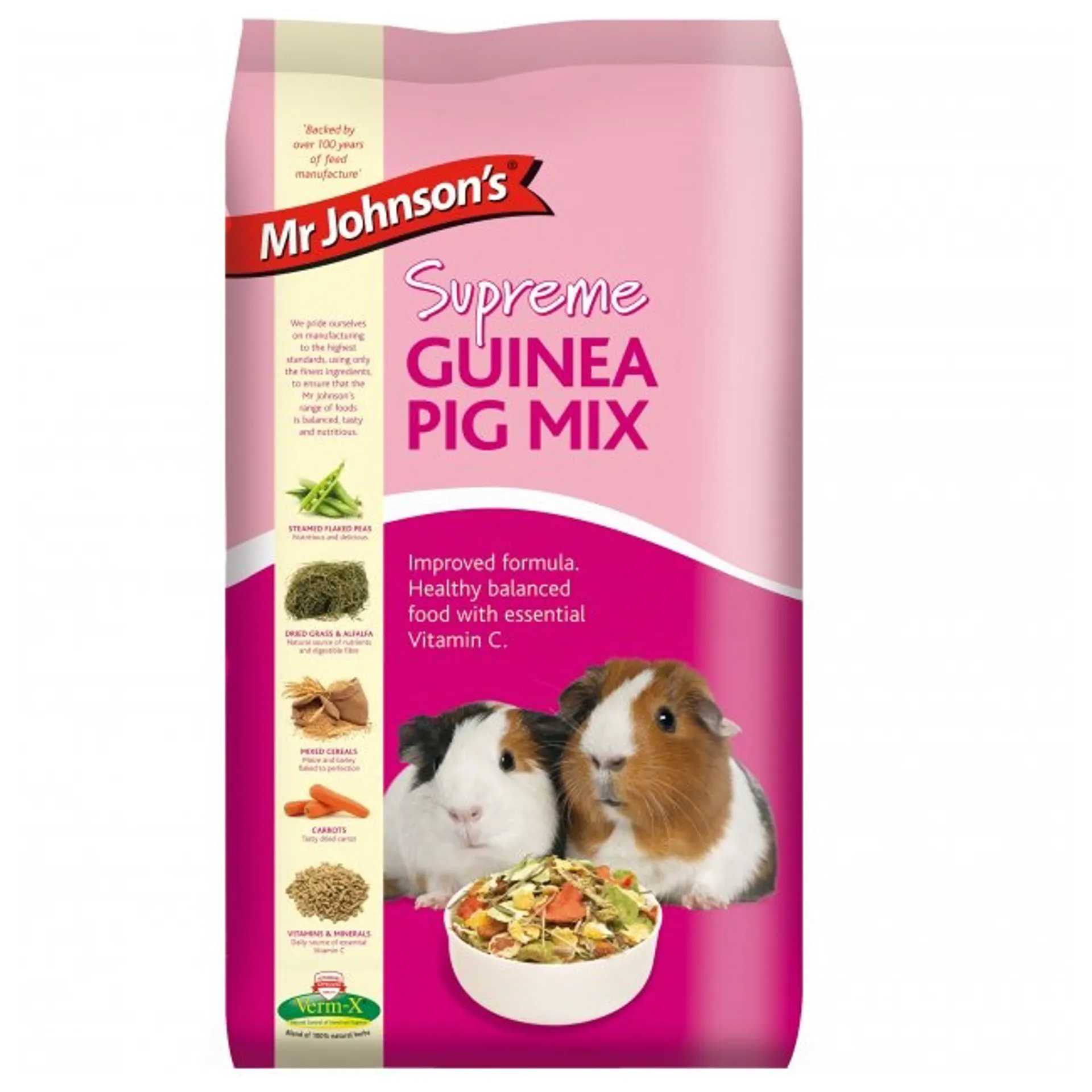 Mr Johnsons Supreme Guinea Pig Mix is a nutritious mix that is packed full of steam flaked ingredients like peas, cereals, grass, alfalfa, pellets and extrusions. This wide range of ingredients supplies guinea pigs with all the nutrients that they need to live a happy life whilst maintaining good health.