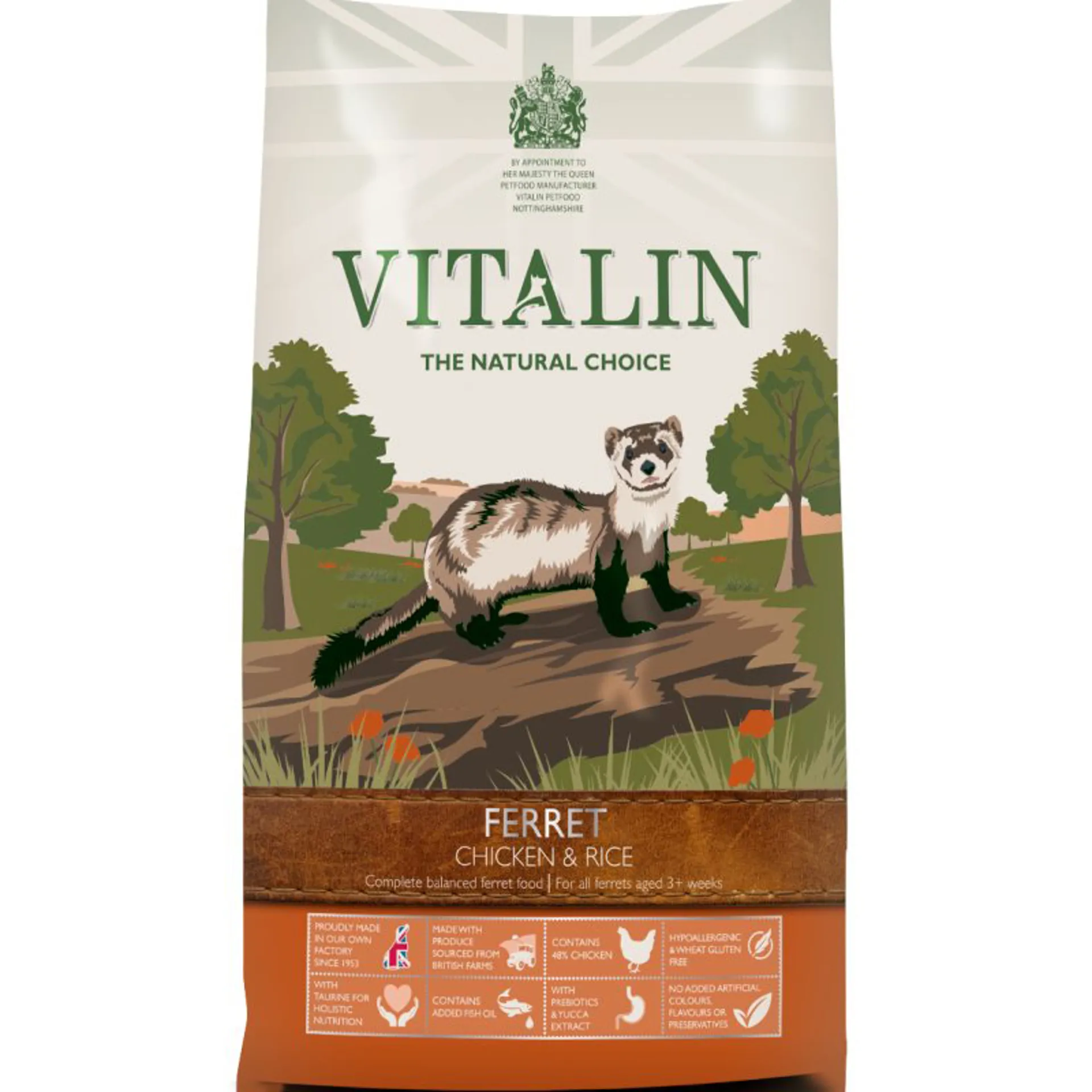 Vitalin Ferret British Chicken & Rice. Vitalin Ferret food has been carefully formulated as a nutritionally complete and balanced recipe for ferrets to provide all the nutrients required for a happy and healthy life. This hypoallergenic and wheat gluten free food contains high quality protein from 100% British Chicken. With veterinary assistance, our nutritionists have worked carefully to formulate a hypoallergenic recipe, combining high quality protein from 100% British Chicken. The food is further enhanced with prebiotic FOS & MOS to support your ferret’s digestive system and yucca extract to help minimise stool odour. To help maintain a healthy skin and coat, fish oil has been included; whilst supplementary taurine is added for your ferret’s overall health and wellbeing. Vitalin Ferret British Chicken is a complete, balanced pet food suitable for ferrets.