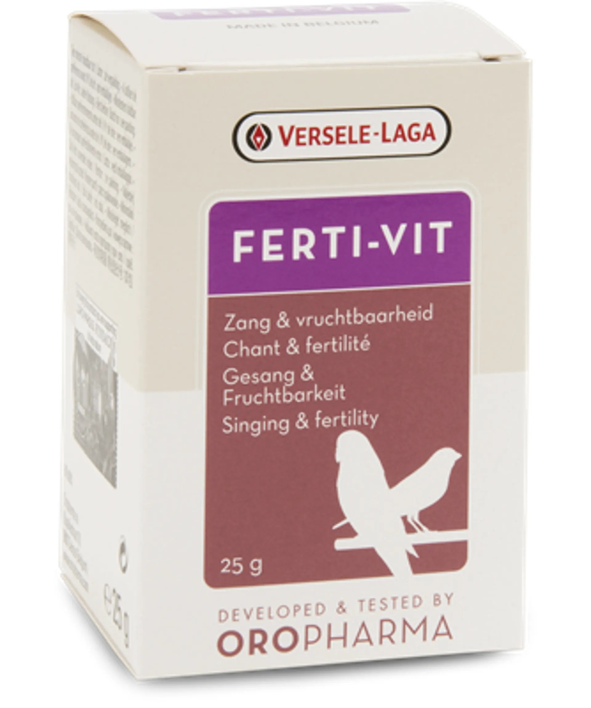 Versele Laga Oropharma Ferti-Vit is a complementary feed for birds. Oropharma Ferti-Vit is a well-balanced blend of vitamins, amino acids and trace elements, enriched with vitamin E. To be used during preparation for the breeding season, for the song of canaries and finches and in cases of laying and fertility disorders or in cases of death in the egg.