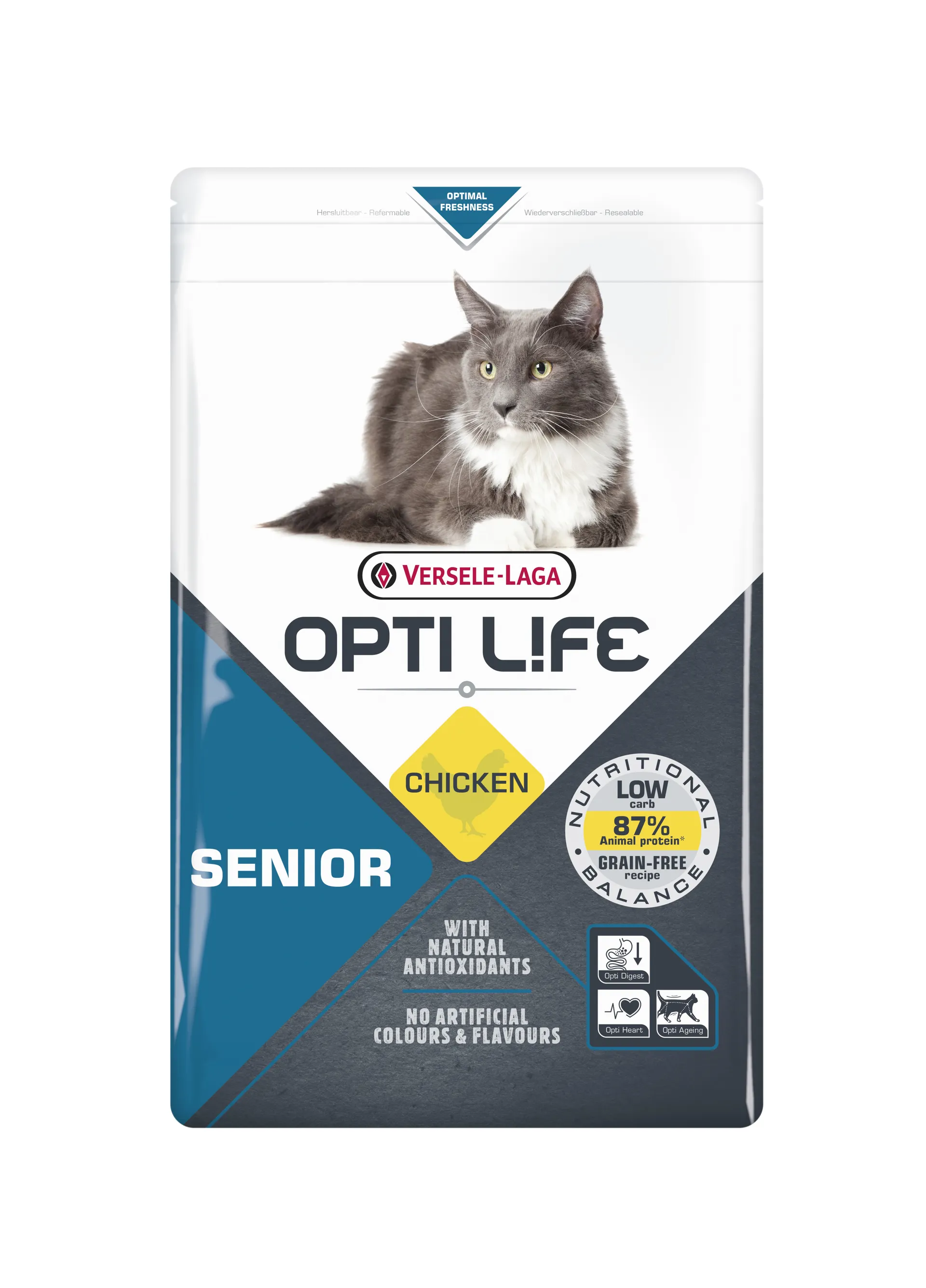 Versele Laga Opti Life Cat Senior Grain Free Chicken. Balanced grain-free premium food - with chicken - for senior cats. Opti Life Senior is a perfectly nutritionally balanced formula based on chicken, low in carbohydrates and grain-free to help your cat age in good health and vitality.